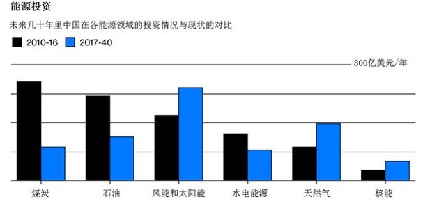 另一个有趣之处在于中国在能源领域上的投入。下图是国际能源署的阶段分析,我们可以从中看出中国从2010年至今在能源供应上的平均年投入,蓝色作为对比是从2017年到2040年的预测值(以不同能源种类分项):