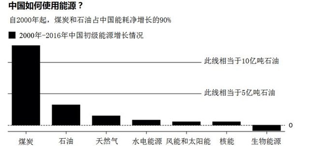 可以看出,中国在煤炭和石油需求增长量上占统治地位,在水电能源增量上也处于领先位置。若将各类能源换算成石油(以能量值为基准进行换算),我们可以明显看出中国经济增长奇迹的背后燃烧了多少石油和煤炭: