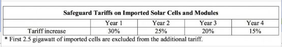 美国政府表示,关税建立在一个逐年下降的规模上。在第一年,他们将对进口太阳能组件和电池的最多征收30%的关税,随后每年将下降5%,直到第四年达到15%。前2.5千兆瓦的进口电池被排除在关税之外。