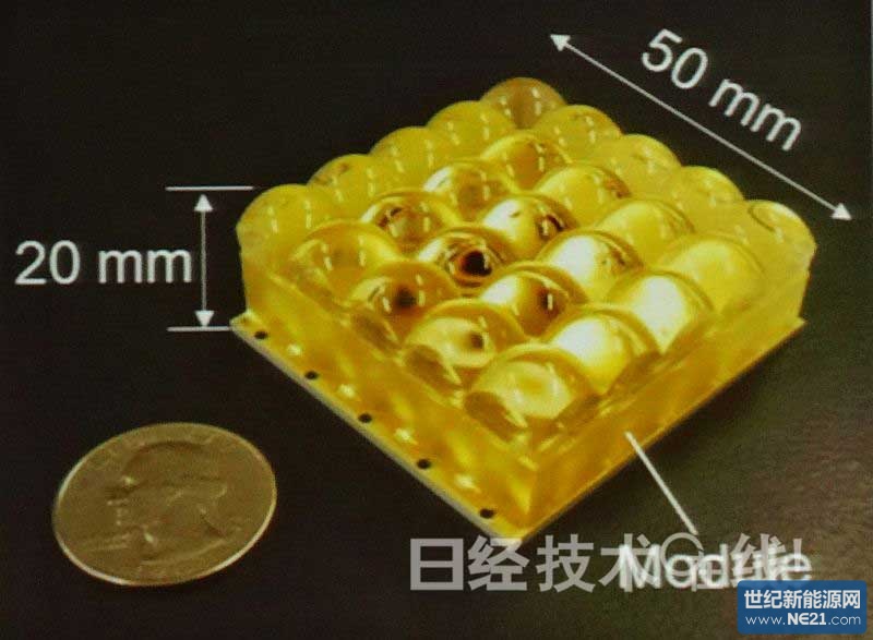 松下此次开发的是在0.95mm见方的太阳能电池单元(用来发电的采光区面积为0.56mm见方)上利用10mm见方的透镜聚光的系统。将单元和镜头均以5×5方式排列,做成了50mm见方的模块,模块厚度为20mm。聚光倍率为625倍。太阳能电池单元是从Solar Junction公司采购的,为采用GaAs基板的化合物三接合型。