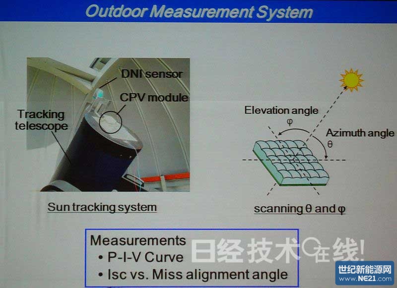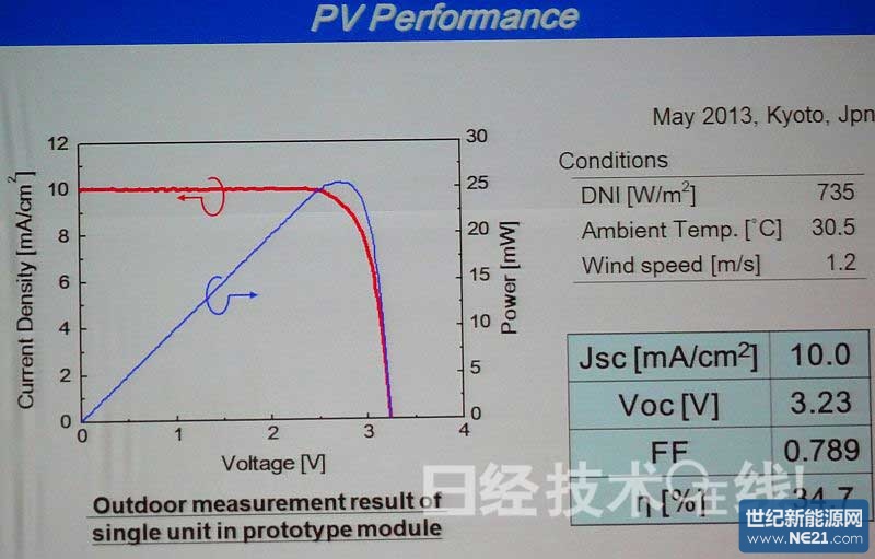 转换效率达34.7%的模块的短路电流密度为10.0mA/cm2,开路电压为3.23V,填充因子为0.789。测试是在京都进行的,测试条件为气温30.5℃、风速1.2m/s、直射日照(DNI)735W/m2。(记者:河合 基伸)
