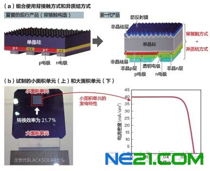 | 图1:旨在通过新构造实现高效率化 夏普开发出了组合使用背接触方式和异质结方式的新构造单元(a)。小面积单元的转换效率目前为21.7%(b)。夏普计划进一步实现高效率化。(图:夏普) |