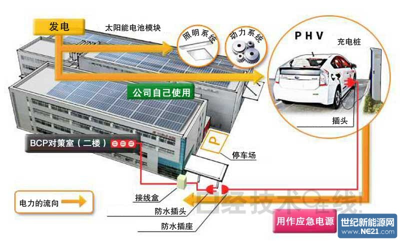 从事汽车生产设备等业务的日本神技保寿美(Shintec Hozumi)公司于2014年4月8日宣布,在总部办公楼导入了一个新型系统,可以将光伏发电系统提供给插电式混合动力车(PHV)的电力作为应急电源使用。