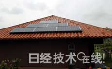 | 研究用的住宅。本来是OIST的教师住宅。 | 屋顶上安装了太阳能电池板。将6块输出功率为233W的电池板组成一组,根据房间大小设置了2组或3组。 |