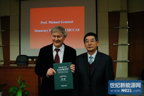 下午, Grätzel教授做了名为“Nanostructured photosystems for the generation of electricity and fuels from sunlight ”的学术报告。并被授予“中国科学院上海硅酸盐所名誉教授”,上海硅酸盐所党委书记、副所长王龙根为其颁发了聘书。