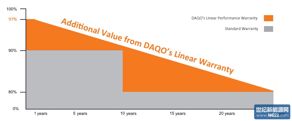 日前,南京大全新能源有限公司宣布从2013年1月1日起,将在10年质保基础上,对其主流产品增加执行25年输出功率的线性质保服务。南京大全新能源对其单晶组件和多晶组件提供的25年功率质保将从工厂发货日算起第一年内,输出功率不小于产品标称输出功率的97%,以后平均每年输出功率衰减不大于标称输出功率的0.65%,25年后产品输出功率不小于其标称输出功率的81.4%。