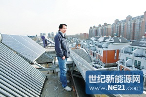 在他家楼顶,9块太阳能电池板分两组面向太阳而立,在一片太阳能热水器中间十分显眼。徐鹏飞向笔者介绍,发电系统总装机2千瓦,全部采用多晶硅电池板,电量自发自用、余电上网。“设计年发电2600度呢,肯定够家用的了。”