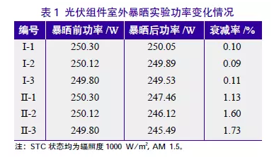 分别取I和II光伏组件各3组进行试验,记录其在STC状态下的功率输出值。随后,将I和II光伏组件放置于辐照总量为60kWh/m2(根据IEC61215的室外暴晒试验要求)的同一地点进行暴晒试验,分别记录其功率,结果见表1。