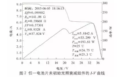 由图2中I-V曲线出现台阶可看出,组件内部整体输出功率下降的同时,未经初始光照衰减的电池片造成光伏组件整体电流降低、输出功率减小。