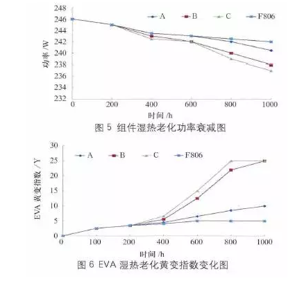 由图5和图6可看出,不同品牌的EVA耐湿热老化性能差异很大,其中F806EVA黄变小,耐老化性能明显比其他EVA强,做成的组件功率衰减少。这个实验结果与组件老化功率衰减结果相符合,说明EVA黄变是组件材料老化导致功率衰减的一个重要原因。