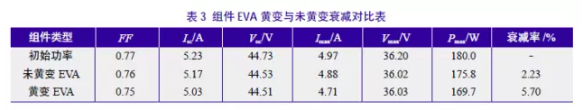 由表3可知,EVA未黄变组件在电站运营过程中只衰减了2.23%,而EVA黄变组件的功率衰减了5.7%,因此进一步验证了EVA黄变是造成组件功率衰减的一个重要原因。