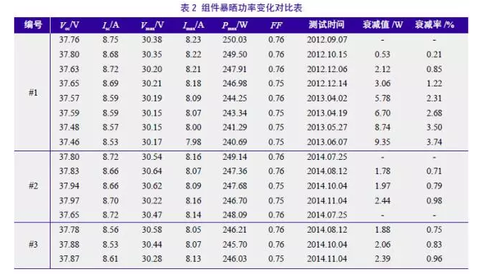为确保组件功率质量,在组件制造过程中,随机对抽取组件进行太阳下暴晒,暴晒至组件功率基本稳定为止,检测其初始光致衰减值,测试数据见表2。