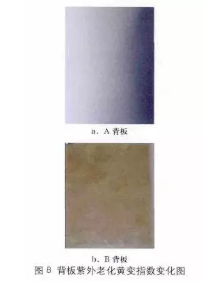 把组件分为A、B两组,分别采用两个不同厂家的背板材料(A组背板为双面含氟背板,B组为不含氟的背板),电池片、玻璃、背板、焊带、边框等材料及生产工艺设备都一致,制作每块组件的同时还制作一个陪样,用于测试背板的耐紫外黄变指数。生产出的组件经过EL检测和I-V曲线的测试,确定质量合格,实验前记录两组光伏组件及陪样组件在STC状态下的功率输出值。按照IEC61215-2005的实验要求,将两组光伏组件放于紫外试验箱中,温度控制在规定范围内(60±5℃),组件受波长为280~385nm范围的紫外辐射(15kWh/m2),其中波长为280~320nm的紫外辐照不少于5kWh/m2[1]。用太阳能测试仪测试组件的功率,结果见表4;同时测试陪样背板及样品紫外老化后的黄变指数,结果如图8所示。