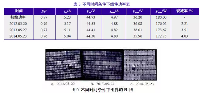 各时间段该组件的EL图片如图9所示,EL图片显示组件内部完好,未发生隐裂等质量问题,每次测试时清除表面的脏污和灰尘,排除外界条件对组件功率的影响。测试结果说明组件功率衰减是由于自身材料老化原因所造成,衰减的比例与功率质保规定的质保统一标准接近。