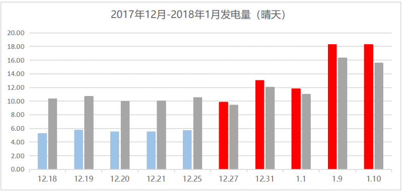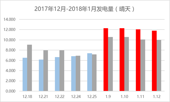 12月30日为优化器运行的第一天,同时加入对比组串的发电量数据灰色部分进行分析以排除辐照量,温度等干扰量的影响,安装优化器后发电量提升比例为39.13%,平均每天提升6.47度电。