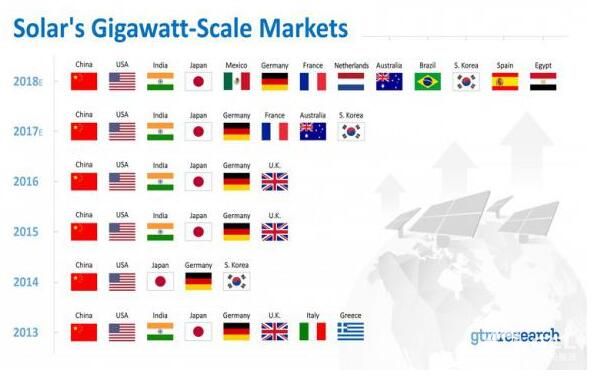 2018年13个国家将跻身全球吉瓦规模太阳能市场