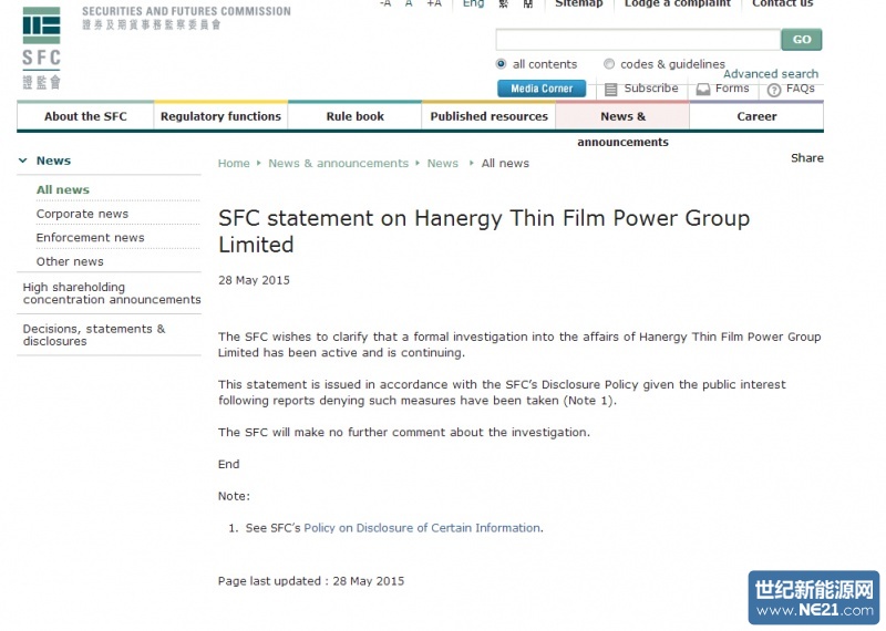 世纪新能源网消息:2015年5月28日,香港证监会就汉能薄膜发电集团有限公司发出声明证监会澄清,已就汉能薄膜发电集团有限公司的事务进行调查,有关调查仍在继续。