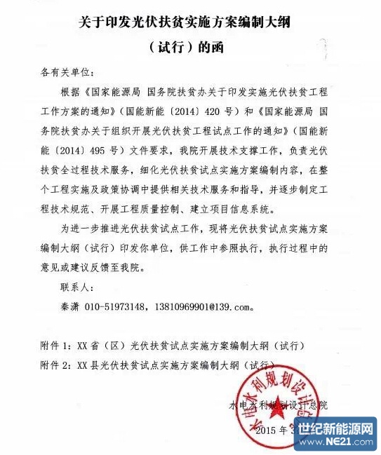 【世纪新能源网记者张思思报道】2015年3月9日国家能源局新能源司向求河北、山西、内蒙古、安徽、云南、甘肃、青海、宁夏、新疆省(自治区)发展和改革委员会(能源局)、扶贫办、各派出机构、水电规划院:为做好光伏扶贫试点工作,水电水利规划设计总院下发《关于转发光伏扶贫试点实施方案编制大纲的函》。要求参照完善区域内光伏扶贫试点的实施方案,有关意见或建议反馈至水电水利规划设计总院。