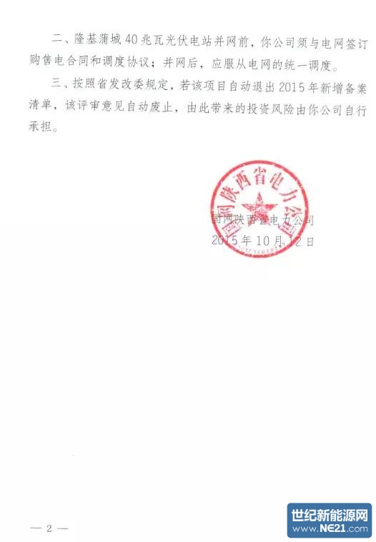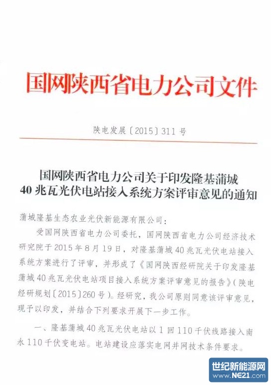 隆基蒲城40兆瓦地面光伏电站获首个2015年陕西省电力接入批复