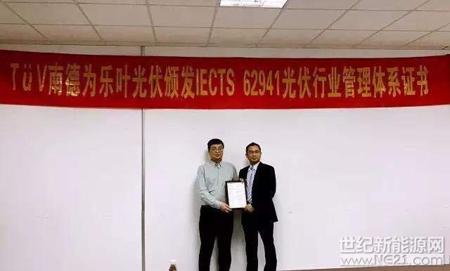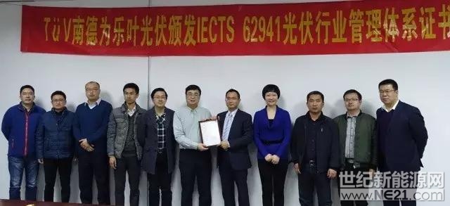 TÜV SÜD为乐叶颁发IEC TS 62941光伏行业管理体系认证证书