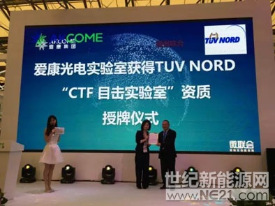 4月19日,爱康光电正式获得TUV NORD“CTF目击实验室”资质,授牌仪式在上海新国际博览中心2017年SNEC展会隆重举行。