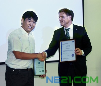 山东孚日光伏科技有限公司总经理王岩先生在获颁证书时与 TUV 南德意志大中华集团 CEO & 总裁范华德先生合影