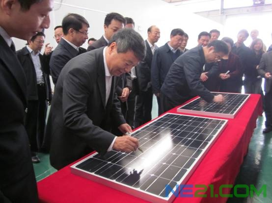 考察团首先参观了太阳能电池生产车间,周总向徐部长一行详细介绍了湖南兴业太阳能单晶硅电池片生产线,同时对电池片厂房的设备、产能、规划作了详细的汇报。在光伏组件生产车间里,徐部长一边参观一边向周总了解相关产品情况。当他得知湖南兴业园区自动工到投产只用了不到一年的时间时,更是赞叹不已,并向陪同参观的国土资源厅负责人要求,国家政策是扩大内需拉动生产,兴业太阳能这样的产品,这样的建设速度都是值得宣传和推广的。徐绍史部长和周强书记还兴致勃勃地在展示组件板上签名留念。