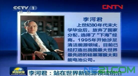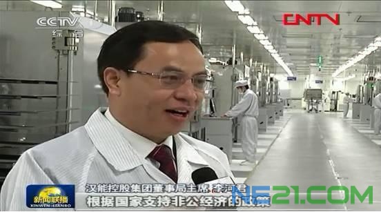 2011年12月2日,就在全国非公有制经济先进典型事迹报告会成功召开的当天晚上,中央电视台《新闻联播》栏目播出了题为《李河君:站在世界新能源领域前沿》的专题报道。中央电视台记者通过对汉能控股集团董事局主席李河君的专访,让电视机前的观众领略到了我国民营清洁能源领军企业家的风采。