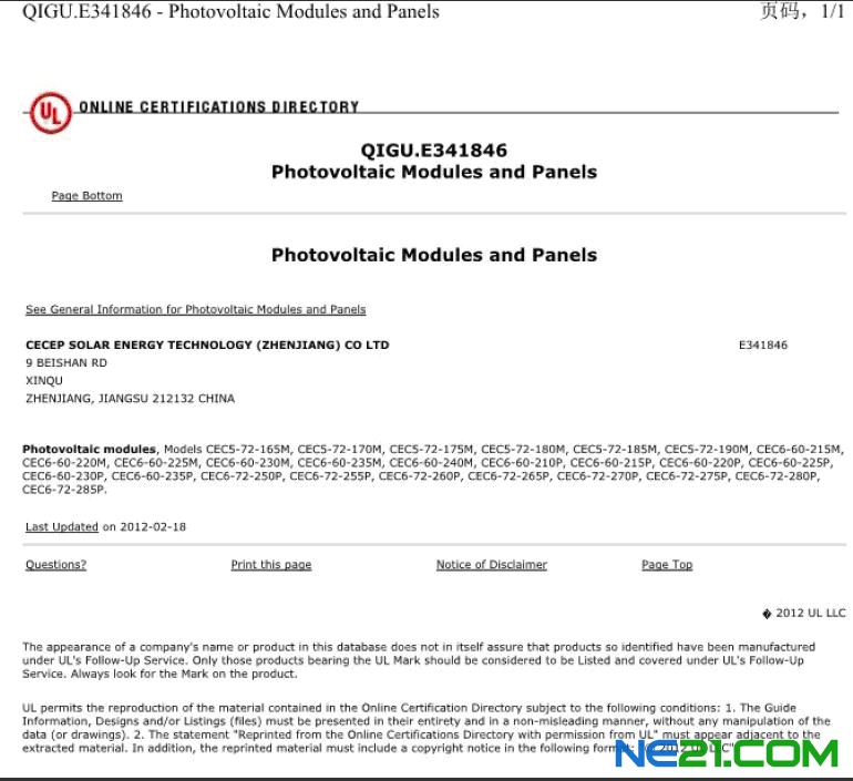 中节能太阳能科技(镇江)有限公司的组件产品于2012年4月23日通过UL认证。