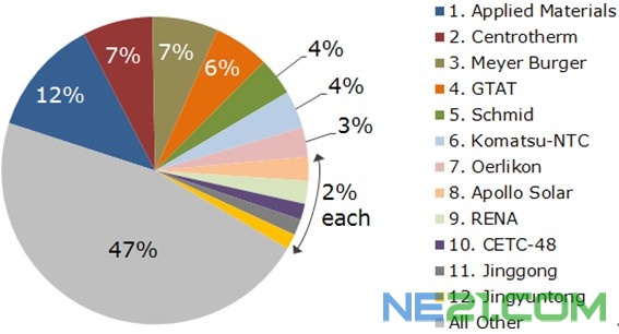 按照2011年光伏设备确认营收计算,应用材料将继续保持第一名的领先位置。预计应用材料的晶体硅光伏设备收益较2010年增长率超过60%,其硅片和电池后段制造设备被全世界各个区域和类别的客户广泛使用。