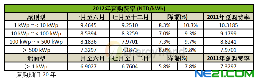 台湾的再生能源电能趸购费率在2012年2月7日公布。集邦科技旗下品牌EnergyTrend观察自2012年开始,多个国家进行电费补助的下修调整,主因在于2011年太阳能模组价格的大幅下跌,各国的安装量因此增加,让各国再生能源的预算快速消耗,包含德国、希腊、英国、瑞士等都在2012年初进行了补助政策的检视,针对不同的系统大小给予不同程度的补助修正。受到政策不确定的影响,第一季的需求呈现集中在欧美等国,后续则由中国、美国、日本、澳洲接棒。EnergyTrend 预估今年的需求量将达到26GW,相较于2011年实际安装量,仍呈现微幅成长。