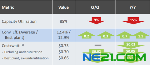 受累于产能利用率下滑和关停部分生产线,First Solar 1Q12的组件成本为0.73美元/瓦,(仅比去年同期减少了0.02美元/瓦,而且被晶硅路线的部分厂商追平,如同期阿特斯太阳能(CSIQ)$为0.73美元/瓦,昱辉阳光(SOL)$为0.74美元/瓦)。如果不考虑产能利用率的影响,Q1的平均组件成本为0.70美元/瓦,新生产线的成本为0.66美元/瓦。