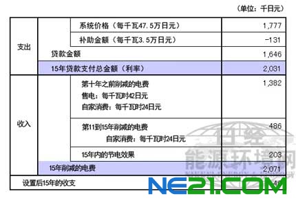 | 回收初期投资所需期间的估算。在设置之后第15年,收支达到平衡。示例为在大阪府内的住宅上,以与水平面呈30度的角度朝南设置了3.74kW的电池板。假设设置电池板没有地方政府的补贴,仅有国家补贴。(资料:夏普) |