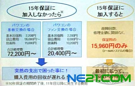 | 比较加入15年保修以及未加入的情况。在未加入15年保修的情况下,如果第11年之后功率调节器出现故障,更换了基板,需花费7万日元以上的修理费。(资料:夏普) |