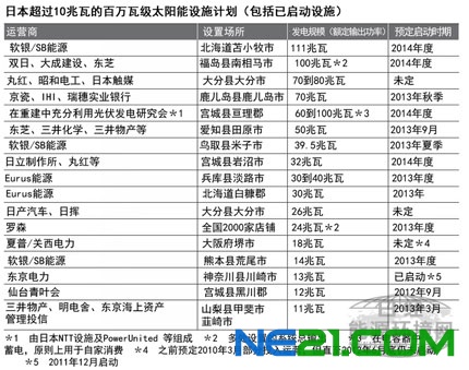软银集团动作很快,7月1日在京都市伏见区及群马县榛东村启动了百万瓦级太阳能设施。以北海道苫小牧市的111兆瓦系统为首,该集团正在日本各地推进百万瓦级太阳能计划,目前全部计划的总输出接近200兆瓦。东芝、日立制作所、京瓷及NTT设施公司等也在制定大规模百万瓦级太阳能设施建设计划。设置用地方面,有的是利用受2011年3月东日本大地震引发的海啸侵袭而变为荒野的土地,有的是利用1990年左右泡沫经济时期滥建的高尔夫球场,还有为了招揽工厂进驻而填海造地,却因经济不景气、招商不顺而闲置的土地等,这样的事例在逐渐增多。除了大型企业之外,还出现了由市民共同出资成立发电公司的情况。预定在2014年度底前启动的1兆瓦以上百万瓦级太阳能设施目前已达100多处,总输出将超过1吉瓦。