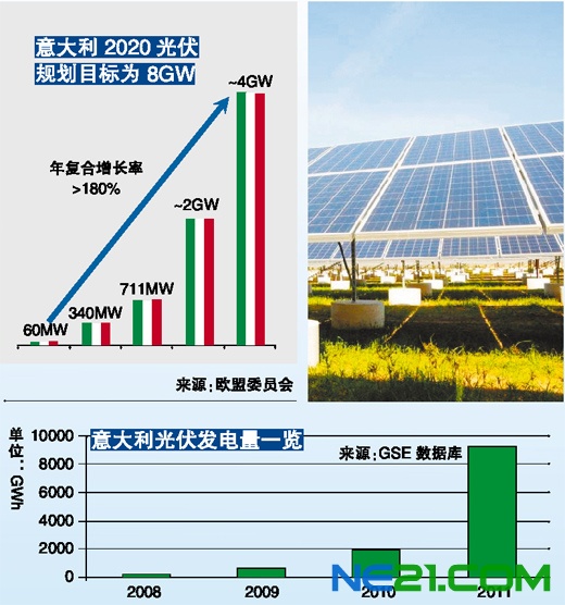 在补贴负担日益沉重的同时,光伏电池板价格大幅下滑。2008年贝卢斯科尼重掌政权,中右翼政府上台后就此展开了激烈讨论,意大利最终在2010年颁布第三能源法案,其核心被外界解读为下调FIT。为了达到欧盟整体的气候变化和能源目标,意大利同时还制订了本国的光伏发展规划:计划到2020年全国光伏装机要达到8吉瓦。但很多市场人士认为,8吉瓦的目标野心太大,很有可能完不成。