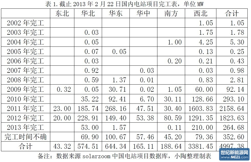 根据Solarzoom的中国电站项目库的样本数据显示,截止到2013年2月22日止,全国总共披露已完工的项目是4997MW(包含了并网项目和离网项目以及金太阳金屋顶项目),其与官方公布的数据并不冲突。