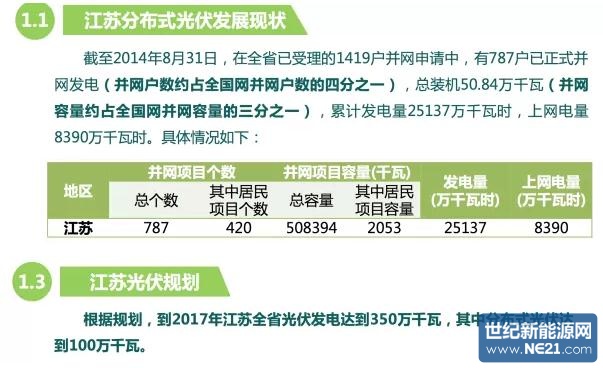 截止到8月31号,江苏全省申请光伏总数是1419户,总的容量达到111.5万千瓦。在这么短的时间里,从江苏发展的数量和容量来看都是非常了不起的,而且随着光伏造价的降低,未来可能是一个更快的趋势。根据规划,到2017年江苏省将有1500千瓦的装机。