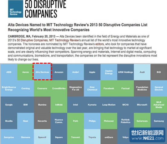 Alta Devices曾在2012年、2013年连续被全球历史最悠久的科技商业杂志MIT Technology Review(麻省理工学院《科技创业》)评为“全球最具颠覆性创新公司”,与Google、IBM、Intel、微软、三星等世界知名企业共同上榜。