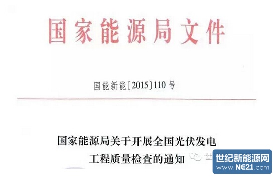 世纪新能源网(记者张松报道):2015年4月7日,国家能源局向各省(自治区、直辖市)发展改革委(能源局)、新疆生产建设兵团发展改革委,各派出机构,国家电网公司、南方电网公司、内蒙古电力公司,水电水利规划设计总院、鉴衡认证中心、中国质量认证中心、中国电力科学研究院下发——《国家能源局关于开展全国光伏发电工程质量检查的通知》国能新能[2015]110号文件。