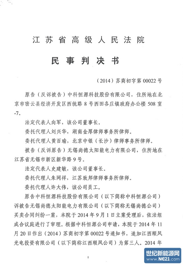中科恒源于2014年9月1日正式起诉无锡尚德未履行编号为 C-M-201312127《太阳能组件销售合同》及其补充协议的相关约定,中科恒源要求无锡尚德返还全部货款2.06亿人民币及承担相应违约责任,并于2014年9月3日收到案件受理通知书。同年12月25日无锡尚德反诉中科恒源,要求中科恒源支付2.466亿元损失。