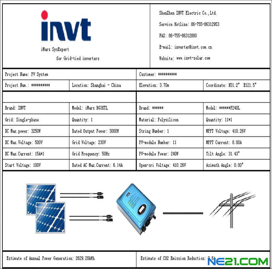 凭借多年电气传动、工业控制、新能源等领域的技术积累与应用经验,基于对光伏并网发电系统的需求及未来发展的理解,英威腾致力于研究稳定、高效、免维护的逆变拓扑技术,成功推出iMars系列组串型(多组串型)光伏并网逆变器,可广泛应用于家庭住宅、建筑集成、商业电站等分布式光伏并网发电系统,服务于清洁能源! 系统描述:光伏组件:240w多晶太阳能组件数量:11组系统功率总计:2650W 逆变器:iMars B 系统 BG3KTL电网:单相数量:1套功率总计:3250W 上海年均光照强度为1078.5kWh/㎡/day,平均日照时间为3小时。预计年最大发电量:2629.09kWh估计二氧化碳减排量:2.6t
