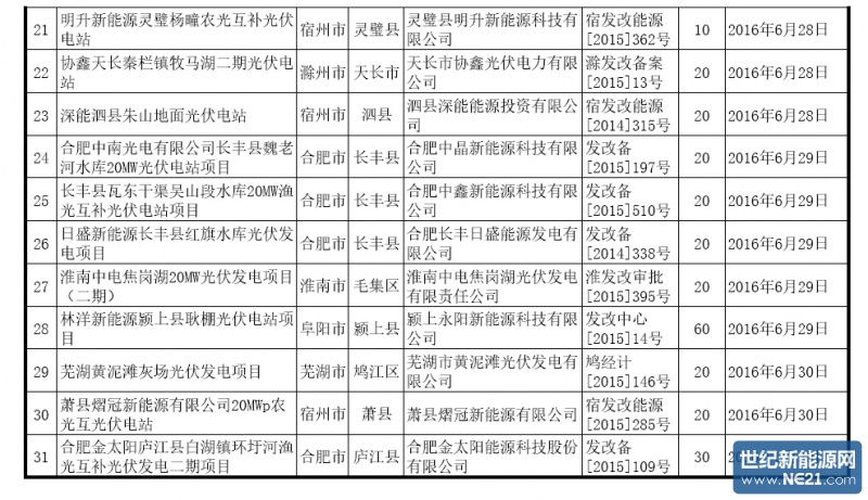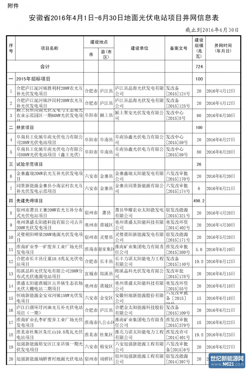 安徽省4-6月31个724MW地面光伏电站并网详表