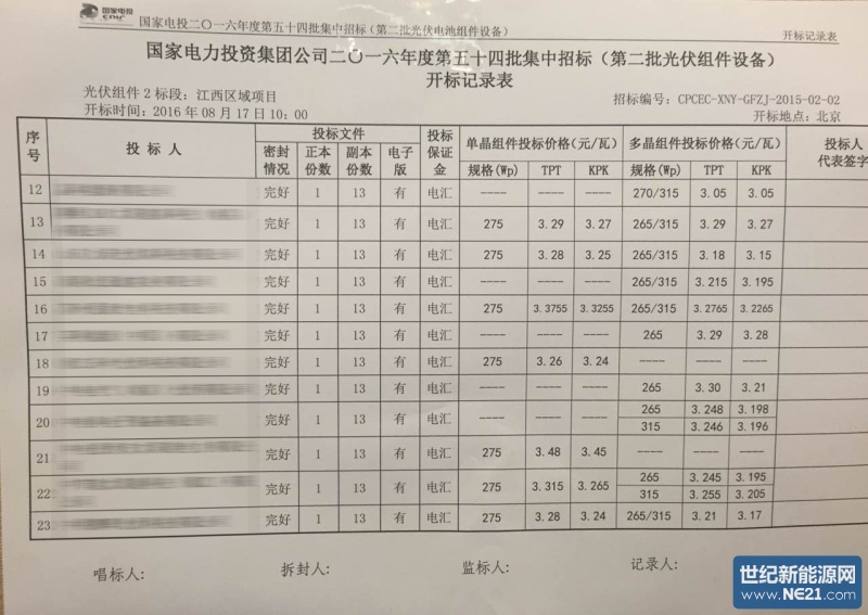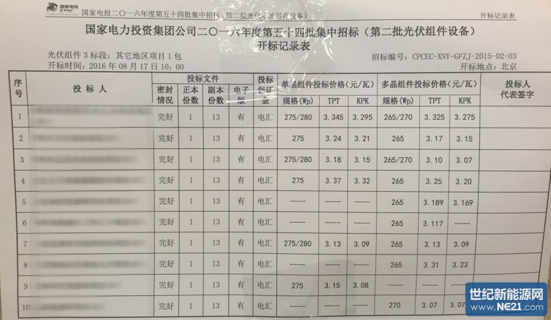 本网记者获得的一份开标记录表显示,投标价格中:多晶KPK背板最低为3.05元/瓦,多晶TPT背板最低为3.05元/瓦。单晶KPK背板最低为3.08元/瓦,单晶TPT背板最低为3.13元/瓦。多晶硅价格普遍在3.25元每瓦左右,多家企业报价达到3.07元和3.09元,该投标价格是继中广核500MW爆出低价之后再创新低。
