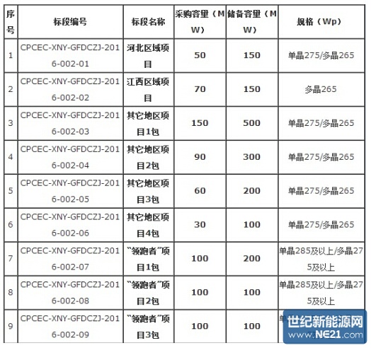 2016年度第五十四批光伏组件招标量信息表