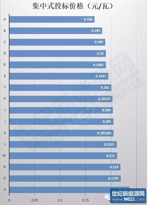 集中式逆变器共计16个厂家参与投标,最低0.168元/W,最高0.236元/W。平均价格0.2019元/W。