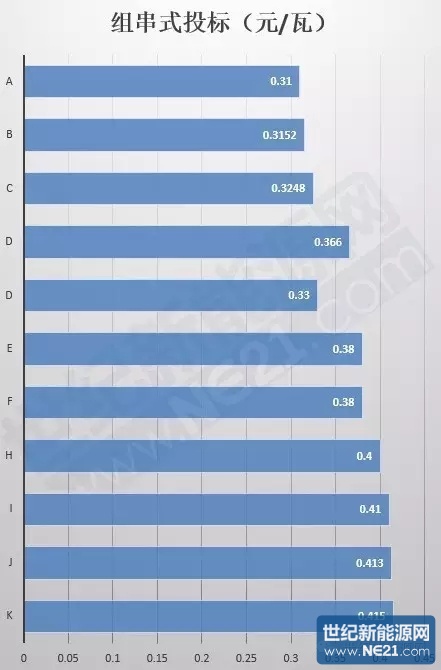 组串式逆变器共计11个厂家参与投标,最低0.31元/W,最高0.415元/W。平均价格0.3676元/W。