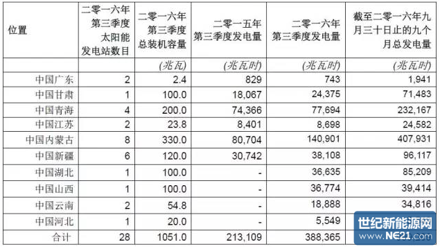 第三季度,联合光伏集团完成收购河北20兆瓦以及云南35兆瓦太阳能电站项目,截至2016年9月30日止,本集团累计总装机容量突破1吉瓦。目前,本集团存量电站运行情况依旧良好,其中内蒙古及青海省电站发电量对贡献较大,发电量分别占该季度总发电量的40.83%和23.24%。同时,新收购的河北电站及云南电站已分别于2015年年末及2016年年中并网发电,对本集团第三季度发电量有所贡献。