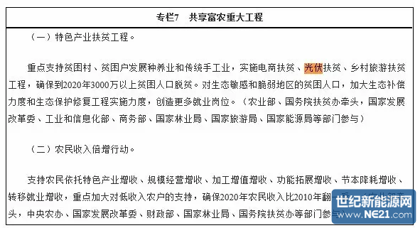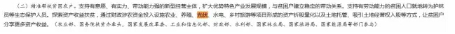 在扶贫方面,国务院责令:农业部、国务院扶贫办牵头,国家发展改革委、工业和信息化部、财政部、水利部、国家林业局、国家旅游局、国家能源局等部门参与,精准帮扶贫困农户。支持有意愿、有实力、带动能力强的新型经营主体,扩大优势特色产业发展规模,与贫困户建立稳定的带动关系。支持有劳动能力的贫困人口就地转为护林员等生态保护人员。探索资产收益扶贫,通过财政涉农资金投入设施农业、养殖、光伏、水电、乡村旅游等项目形成的资产折股量化以及土地托管、吸引土地经营权入股等方式,让贫困户分享更多资产收益。