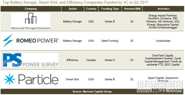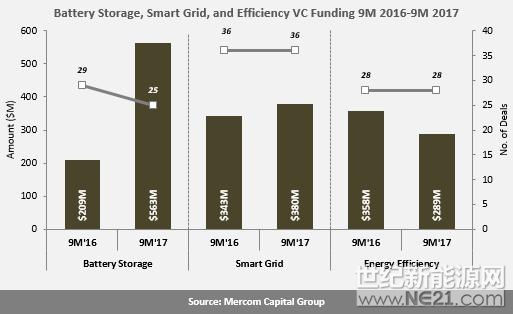 Mercom资本发布第三季度报告称,2017年1-9月,全球智能电网、电池储能和能效企业获得风投资金12亿美元,同比增长32%。